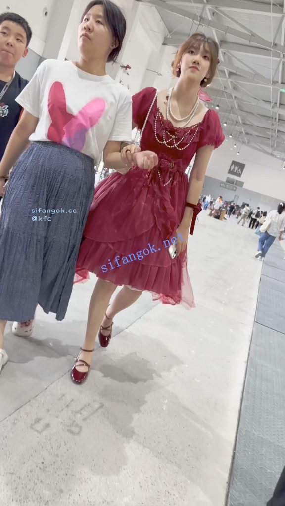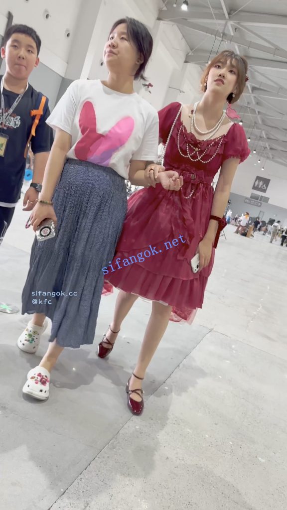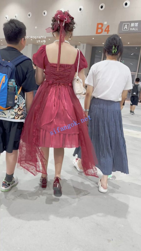 • 学生妹跟着妈妈弟弟逛街·红色长裙白色一次性内微透